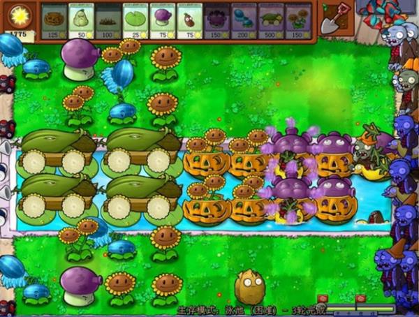 最可怕的僵尸是炸彈僵尸,當(dāng)炸彈僵尸的音樂(lè)出現(xiàn)時(shí),別猶豫,就是一個(gè)炸,可以適當(dāng)選用炸彈,還有,炸彈僵尸出現(xiàn)時(shí),可以選寒冰菇,缺點(diǎn)是費(fèi)錢(qián),以防萬(wàn)一,炸彈僵尸上陣時(shí)要選上睡蓮、大噴菇、咖啡豆,以便隨時(shí)補(bǔ)上戰(zhàn)斗力,如果陣容完整,巨型僵尸和冰車(chē)頂多走四個(gè)格子,所以沒(méi)什么可怕的,注意后路不要被礦工僵尸吃掉,隨時(shí)罩南瓜罩(如下圖所示):