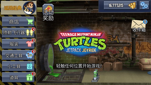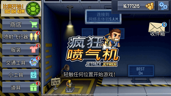 進(jìn)入瘋狂噴氣機(jī)游戲的主界面,先點(diǎn)擊右側(cè)面,打開任務(wù),以任務(wù)為目標(biāo)去完成,接著在右側(cè)面,點(diǎn)擊打開倉庫,可以更換衣服,裝上更強(qiáng)的噴射器,對(duì)裝備升級(jí),在游戲里獲得的金幣,解鎖實(shí)用道具和小工具,在游戲里更快的勝利。