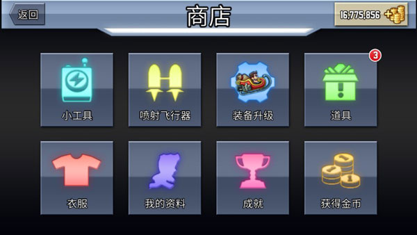 在商場(chǎng)中還能看見小工具、噴射飛行器,裝備升級(jí),道具,衣服等相關(guān)選項(xiàng),依據(jù)自己的喜歡進(jìn)行購買升級(jí),從而讓你的飛行人生更加舒暢。