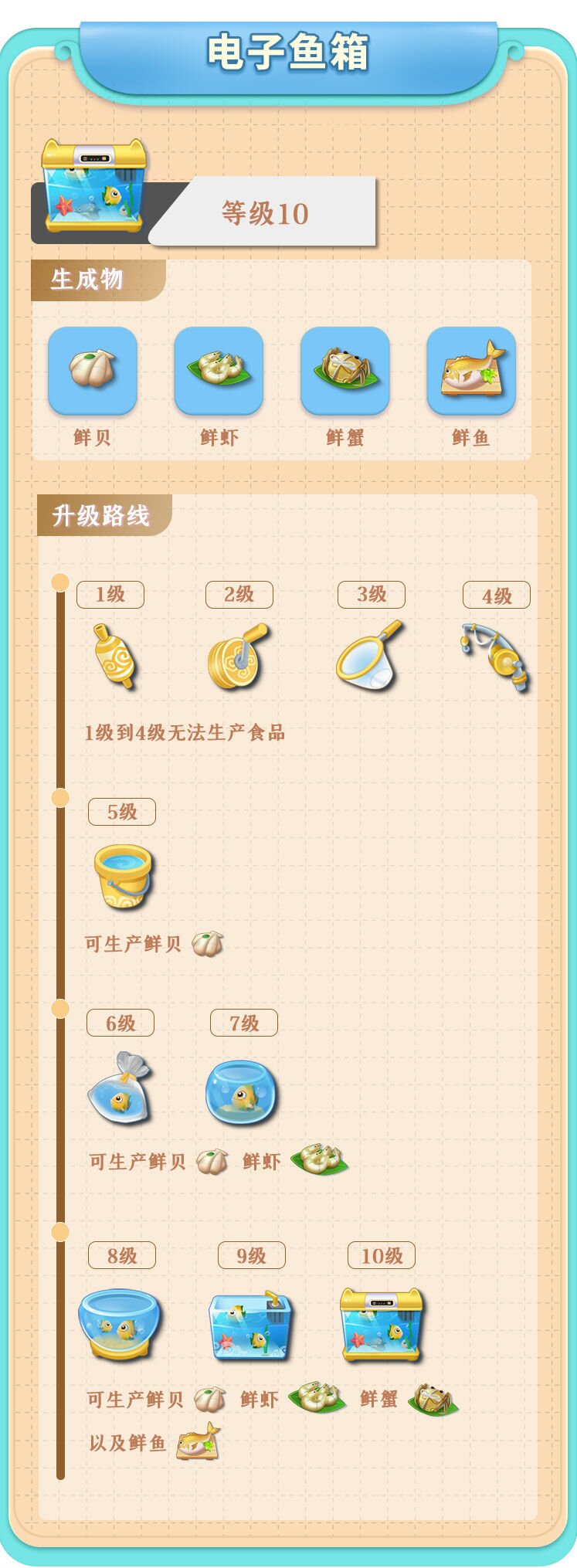 漁線-放線器-漁網(wǎng)-魚竿-漁桶(可生產(chǎn)鮮貝)-魚袋(可生產(chǎn)鮮貝與鮮蝦)-小魚缸-魚缸(可生產(chǎn)鮮貝、鮮蝦、鮮蟹)-魚箱-電子魚箱(可生產(chǎn)鮮貝、鮮蝦、鮮蟹、鮮魚)滿級(jí)10級(jí)