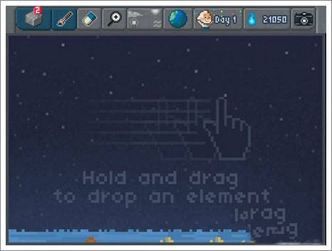 進(jìn)入游戲是一片水,點(diǎn)擊左上角第一個(gè)按鈕,選擇土(soil)和石頭(stone)放入水中,一段時(shí)間后會(huì)得到泥(mub)和沙子(sand),本關(guān)完成。