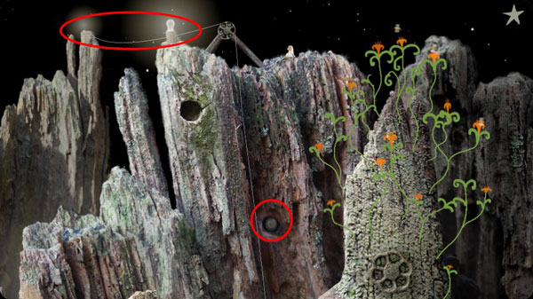 3、點(diǎn)擊右邊的繩子,點(diǎn)擊像信箱一樣的機(jī)關(guān)上面的紅色按鈕,把小人吊上來。