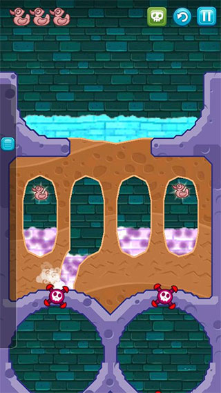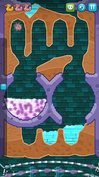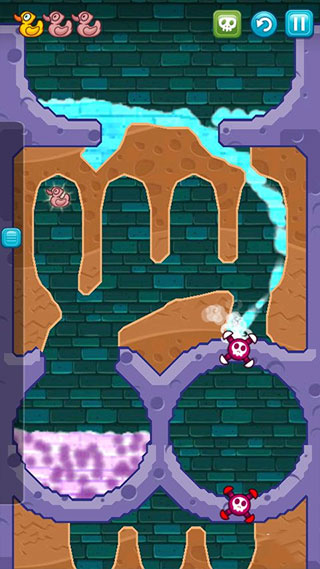 8、挖出如圖一樣的路來,將清水引下,收集到最后一只鴨子,最后將水引入小頑皮的浴室即可過關(guān)。