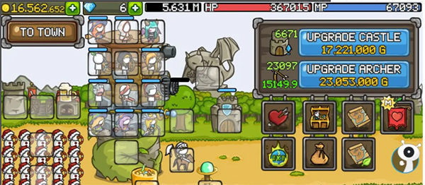 1、進入成長城堡游戲后,可以升級城堡和升級普通弓箭手來提升戰(zhàn)力。