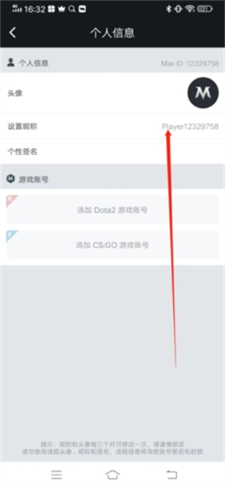 4、在個人信息頁面,我們就可以看到“設(shè)置昵稱”了,點擊右側(cè)的當前昵稱;
