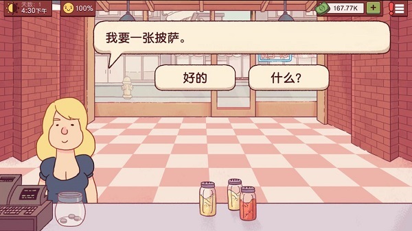 5、30多天之后,攢了錢(qián)先買(mǎi)自動(dòng)切披薩助手(當(dāng)然了其他配料可以買(mǎi)的話(huà)當(dāng)然先買(mǎi)齊配料啊),用了其他配菜助手之后,每天開(kāi)銷(xiāo)會(huì)很大,一天掙不了100了,但可以解放雙手,請(qǐng)考慮選擇,我不建議買(mǎi),只買(mǎi)了醬料助手就有點(diǎn)后悔,請(qǐng)務(wù)必保證自己剩余的錢(qián)大于100塊(我反正少了就很不安啊),49天會(huì)有蟲(chóng)災(zāi),有人幫你驅(qū)蟲(chóng)扣除30塊(心痛),后期好像只要你沒(méi)做錯(cuò)沒(méi)少放多放東西,心情值不好也會(huì)給小費(fèi),nice