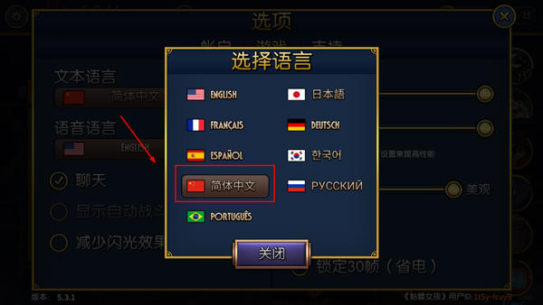 3、最后選擇語言為簡體中文,然后等待一會,游戲語言就調(diào)成中文了。