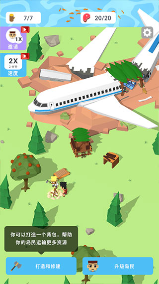 1、在島上開荒種地,播種生存所需要的各種食物吧。2、解鎖斧頭,砍伐樹木,建造房屋,制作工具。