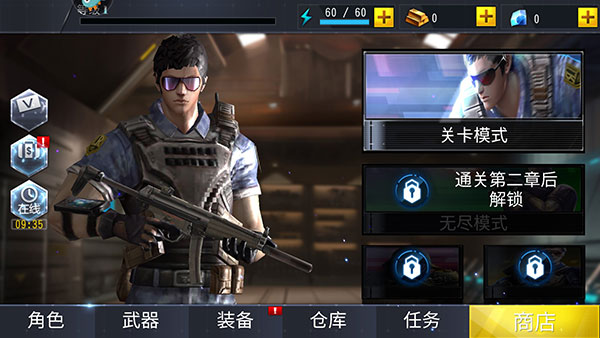 1、先打開游戲,大家可以先查看自己的武器設(shè)備或者是人物的基本信息,也可以前往商場購買武器。