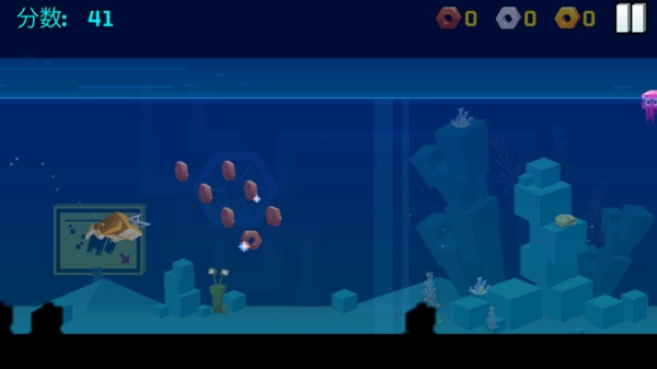 6、水族館大冒險(xiǎn):通過(guò)點(diǎn)擊屏幕使角色下潛,控制高度躲避障礙水母。
