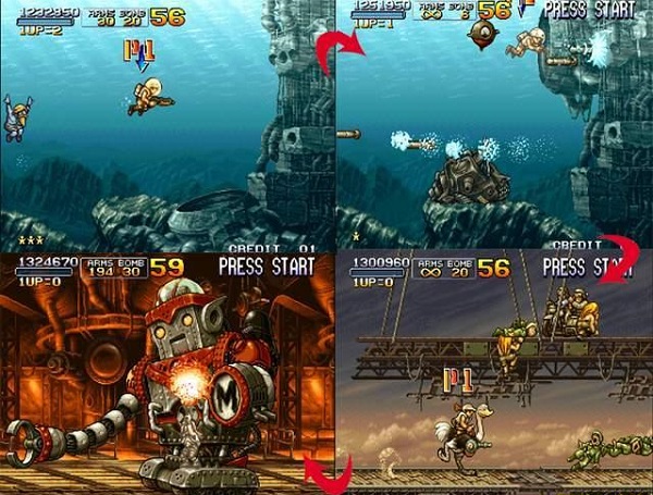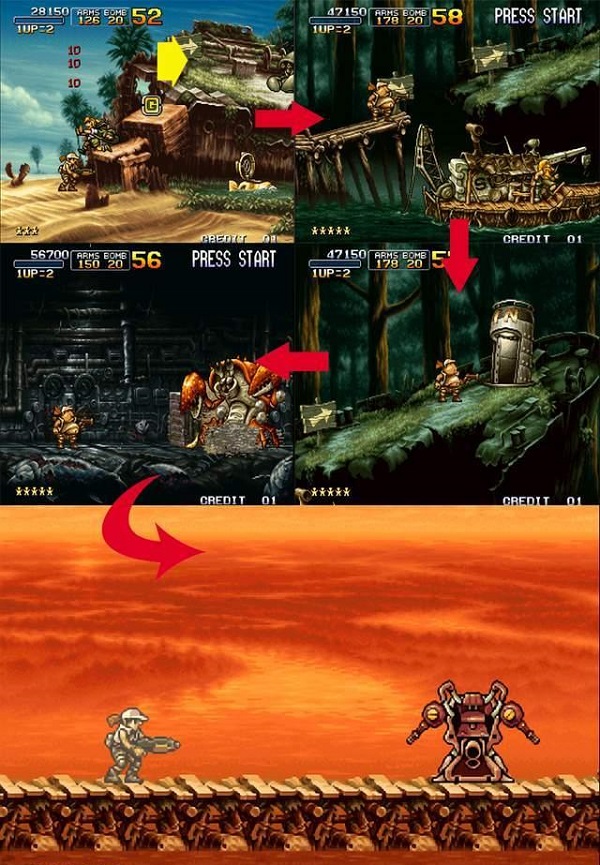 不知道大家注意到?jīng)]有,其實(shí)在《合金彈頭1》和《合金彈頭2》中就已經(jīng)有了隱藏的路線,只是不是那么明顯,不會場景切換。