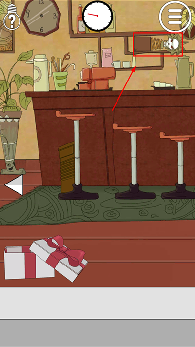 第3關(guān):第二個場景,吧臺后邊的展示柜中得到骷髏,骷髏給下邊的禮品盒,得到禮品盒。讓男主將禮品盒送給女主。