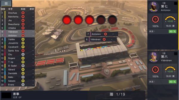 名次:屏幕左側(cè)顯示當前賽事的排名,亦會顯示出車手名字、車隊(以顏色區(qū)分)以及輪胎類型/磨損程度。