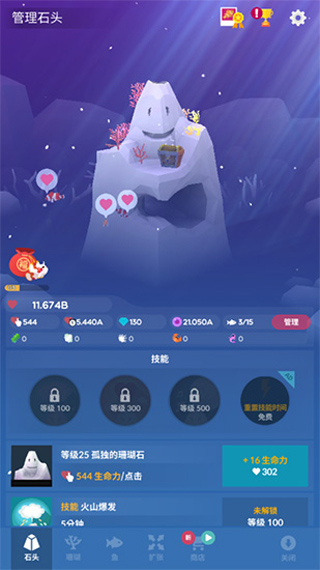 在深海水族館中最常見(jiàn)的新人問(wèn)題就是:先升石頭還是先升珊瑚還是先買(mǎi)魚(yú)?先加什么技能?先要知道,石頭每25級(jí)可以獲得點(diǎn)擊生命產(chǎn)量的翻倍獎(jiǎng)勵(lì)。造一條魚(yú)可以讓點(diǎn)擊和放置的產(chǎn)量都翻倍。