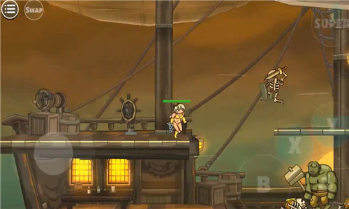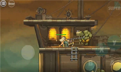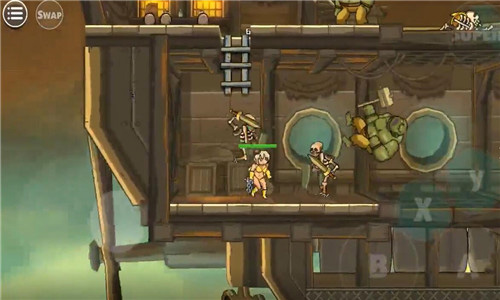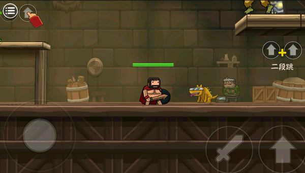 之后選擇完人物我們就要開(kāi)始闖關(guān)生涯了。采用虛擬遙桿的操作,左側(cè)是上下左右的控制鍵子,因?yàn)樘摂M所以沒(méi)有顯示哦,小編玩著玩著之后發(fā)現(xiàn),虛擬搖桿真的蠻神奇,而且可以用盾牌擋住自己進(jìn)行下蹲,之后的關(guān)卡可離不開(kāi)這個(gè)操作噢,抵擋各種不明飛行物的最好方式就是蹲下。這個(gè)A則是攻擊鍵子,B則是跳躍鍵子。還有大招的釋放,當(dāng)然是有CD的。用這幾個(gè)按鍵互相結(jié)合的操作打怪物簡(jiǎn)直不能再舒適了!開(kāi)始的時(shí)候會(huì)左右同時(shí)出怪物,為了避免掉血,就是要看操作之間的配合情況了??梢蕴S到一方進(jìn)行攻擊,也可以迅速打擊左側(cè)之后再攻擊右側(cè),速度是一切的前提。