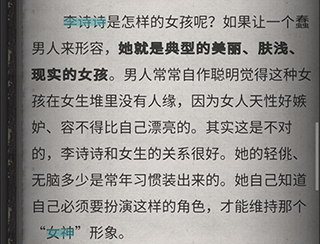 3、在故事的體驗中,玩家自主找出線索,并利用線索,和角色對話后推進(jìn)故事。玩家的選擇將影響了解故事的不同側(cè)面。嚴(yán)格的推理玩法。玩家將扮演一個神秘的聯(lián)絡(luò)者,通過和諸多角色的聊天推理出事件一層層真相。找出隱藏的兇手。