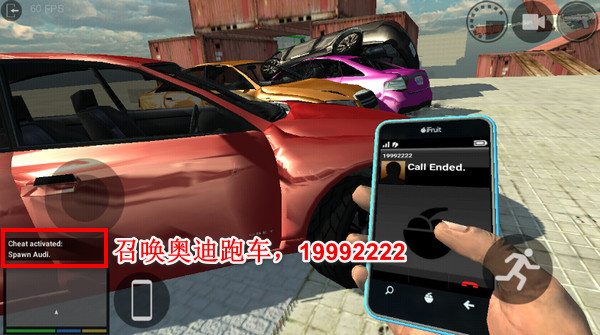 3、調(diào)出手機(jī)菜單,輸入作弊碼,竟然能夠召喚NPC人物和奧迪跑車到眼前,太神奇了。