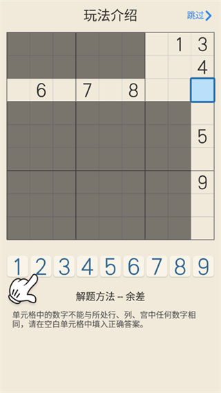 數(shù)獨(dú)游戲棋盤中,橫向的9個(gè)格子被稱為行,棋盤共包含9行,每行都由不重復(fù)的1-9組成。填入正確數(shù)字完成該行。
