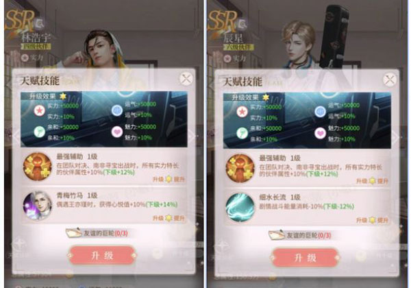 每個SR以上伙伴升級之后會解鎖的天賦技能,SR100級解鎖只有一個,SSR200級還會解鎖一個。每個伙伴技能是不一樣的,會在不同的系統(tǒng)里派上用場。比如說辰星的就是減少能量消耗,這個有點雞肋,前期有劇情榜的時候有用后期就用處不大了。林浩宇的則是和羈絆藍(lán)顏偶遇是,心悅值增加10%,如果王亦瑾是你的主養(yǎng)藍(lán)顏,那這個加成還是不可小覷的。主養(yǎng)伙伴和主養(yǎng)藍(lán)顏一定要搭配好,一個動另外一個也一定要動。藍(lán)顏技能加成還是挺可觀的。