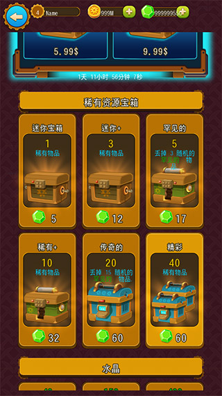 3、回歸獎勵:進入游戲后退出,調(diào)系統(tǒng)時間(我現(xiàn)在是往后調(diào)一年,具體懶的試)進入游戲到礦洞界面幾秒后會出現(xiàn)welcome back的獎勵,有1w+10鉆+能給3個稀有寶石的箱子x2.多來幾次賺夠3個無人機的鉆和學(xué)礦山采集的寶石來資源會快很多,錢么...堆等級或者新自動采集就隨你了。