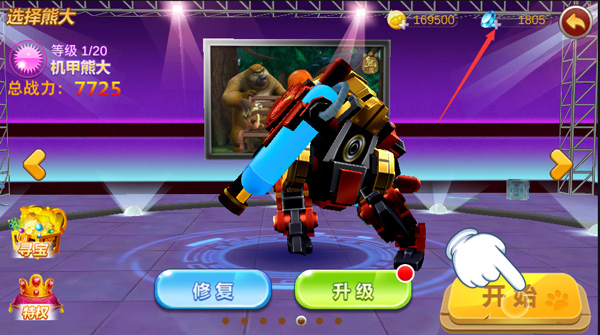 1、在本站下載安裝熊出沒(méi)之機(jī)甲熊大999999金幣鉆石版,運(yùn)行游戲,點(diǎn)擊開(kāi)始;