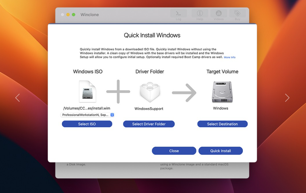 Winclone界面已更新,可與現(xiàn)代macOS完美搭配。在亮或暗模式下運(yùn)行,它看起來(lái)都很棒。當(dāng)您在Dock中添加Winclone圖標(biāo)時(shí),它就適合它。