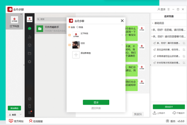 金舟多聊是一款專業(yè)的電腦微信多開輔助工具,能夠在同一電腦上同時(shí)登陸多個(gè)微信賬號。不限登錄數(shù)量,一鍵批量登錄多個(gè)賬號,提高辦公效率。軟件還支持創(chuàng)建話術(shù)列表,云端上傳/下載話術(shù),信息同步更方便!聊天過程實(shí)時(shí)鎖定聊天界面,防止聊天內(nèi)容泄露,電腦辦公更安全!