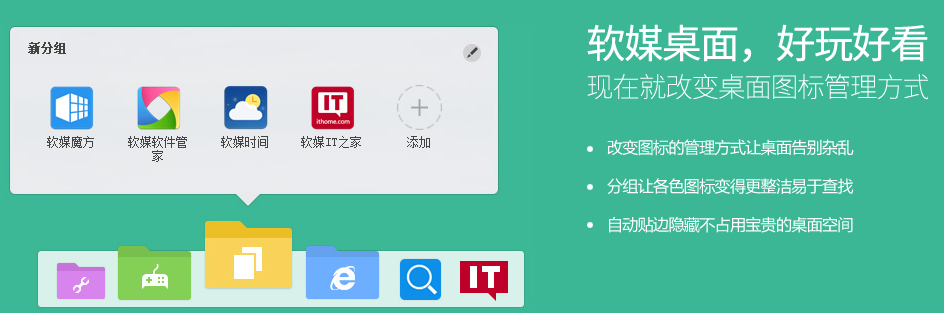2、媒體桌面好玩好看:現(xiàn)在就改變桌面圖標(biāo)管理方式,分組讓各色圖標(biāo)變得更整潔且易于查找。自動(dòng)貼邊隱藏不占用寶貴的桌面空間。
