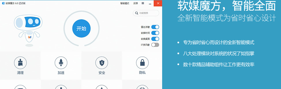“智能模式”傾向于一鍵化,主界面上有常用的八個(gè)功能圖標(biāo)、四個(gè)功能開(kāi)關(guān)和一個(gè)“開(kāi)始按鈕”,非常簡(jiǎn)潔。輕點(diǎn)“開(kāi)始”按鈕,軟媒魔方便自動(dòng)查找系統(tǒng)垃圾、無(wú)用開(kāi)機(jī)啟動(dòng)項(xiàng)、安全隱患、軟件更新情況,再點(diǎn)擊“處理”按鈕,所有問(wèn)題就會(huì)被自動(dòng)處理,簡(jiǎn)單有效,比較適合初級(jí)用戶和追求快捷的用戶。