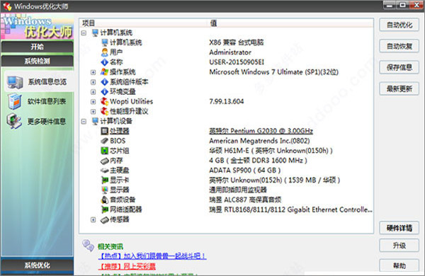 Windows優(yōu)化大師深入系統(tǒng)底層,分析用戶電腦,提供詳細準(zhǔn)確的硬件、軟件信息,并根據(jù)檢測結(jié)果向用戶提供系統(tǒng)性能進一步提高的建議。