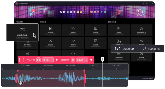 金舟音頻大師是一款全能的音頻處理工具,金舟音頻大師的功能豐富且清晰,因此上手十分容易,能支持多種音頻格式并且還能批量處理,讓工作效率更上一層樓,除此之外,金舟音頻大師還集合了音頻格 式轉(zhuǎn)換、音頻剪輯、音頻合并、音頻提取、音頻 人聲分離等多種實用功能,能滿足您的任何音頻處理訴求,還有超多的產(chǎn)品優(yōu)勢和亮點等您使用體驗。