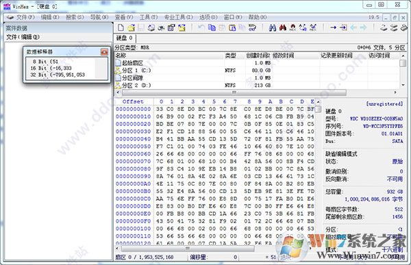 3、這里我們選擇整個(gè)磁盤,再點(diǎn)確定,然后我們就看到了Winhex的整個(gè)工作界面,如下圖: