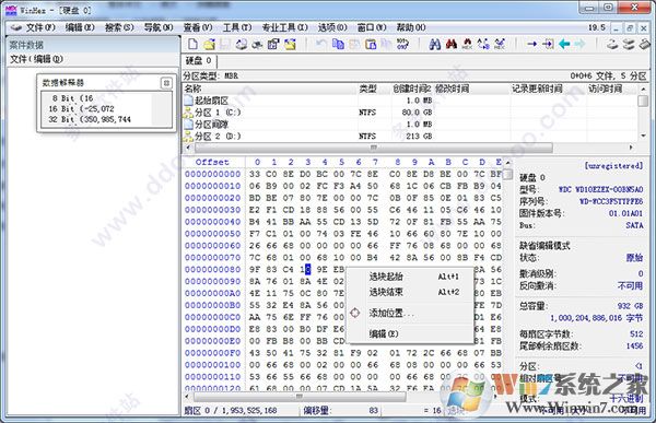 WinHex一直以來(lái)廣受贊譽(yù),是軟件破解、BIOS修改等方面的必備工具,其對(duì)十六進(jìn)制數(shù)據(jù)的處理能力即使是常用的UltraEdit也無(wú)法望其項(xiàng)背的。
