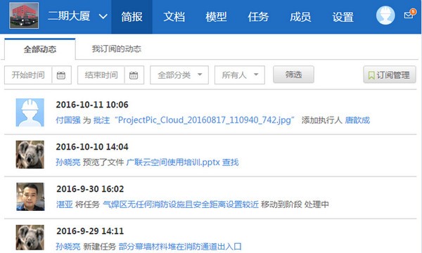 通過訂閱功能,可以及時(shí)關(guān)注個(gè)人工作相關(guān)的文件動態(tài)變化,支持按照時(shí)間,人員,類型(任務(wù)、空間、文檔)進(jìn)行篩選,快速找到所需的簡報(bào)。