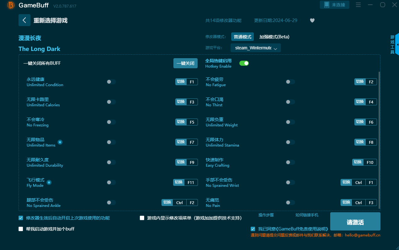 漫漫長夜修改器14項(xiàng)內(nèi)容及熱鍵: