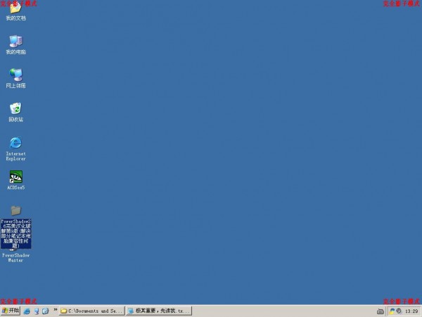 注意:啟動影子系統(tǒng)后,桌面的四角會出現(xiàn)紅字提示啟動到什么模式