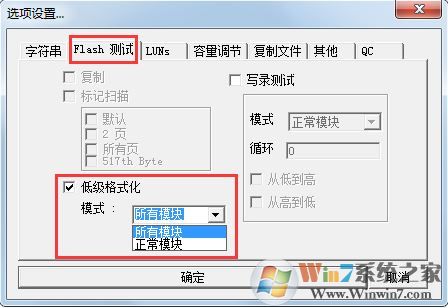 4、請(qǐng)選擇“Flash 測(cè)試”,選擇“低級(jí)格式化”;這里有兩個(gè)參數(shù),一個(gè)是所有模塊(它的意思是低格式化整個(gè)盤(pán)),另一個(gè)是正常模塊(它的意思是只低格式化好的區(qū)塊,這個(gè)參數(shù)適合于含有壞區(qū)的U盤(pán));