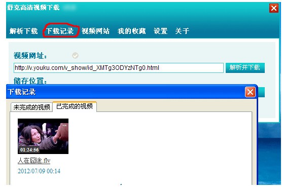 第三步:下載完后,點(diǎn)擊軟件的"下載記錄"按扭,就可以看到剛下載完成的視頻,并且可以利用自帶的播放器播放視頻。