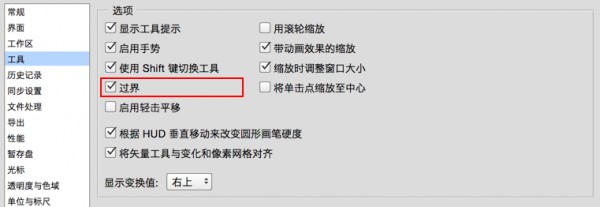 如圖所示:在未打開(kāi)“過(guò)界”的時(shí)候,當(dāng)畫布能夠在界面中顯示完全時(shí),四周是不會(huì)再出現(xiàn)滾動(dòng)條的,當(dāng)打開(kāi)“過(guò)界”后,即使畫布縮放得很小,依然可以用小抓手或滾輪來(lái)移動(dòng)畫布。(在AI中一直是“過(guò)界”狀態(tài))