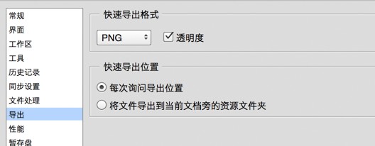 留心的童鞋可能已經(jīng)發(fā)現(xiàn),在之前CC2014版中被炒得很火的切圖神器“抽出資源”在此版本中不見(jiàn)了,沒(méi)錯(cuò),這個(gè)“導(dǎo)出”可以算是“抽出資源”的進(jìn)化版,在首選項(xiàng)中已經(jīng)出現(xiàn)了針對(duì)此功能的設(shè)置,在這里可以選擇導(dǎo)出圖片的格式(JPG、PNG、GIF、PNG-8甚至SVG)和是否透明以及導(dǎo)出位置(自定或默認(rèn)文件夾),具體用法在后文中會(huì)有詳細(xì)介紹~