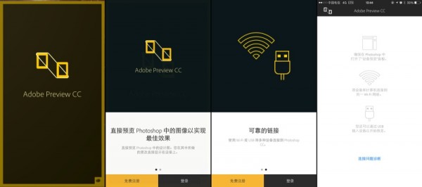 Device Preview也算是一大亮點(diǎn)!功能很簡(jiǎn)單——安裝移動(dòng)端App(Adobe Preview),通過(guò)WIFI或USB即可進(jìn)行多端同步,經(jīng)測(cè)試,顯示效果很好,同步穩(wěn)定時(shí)間快(延遲三秒左右,不同大小文檔時(shí)間不同),多畫板時(shí)可以在App中直接選擇要看哪個(gè),什么PsPlay、ScreenRunner,都可以Say Goodbye了~