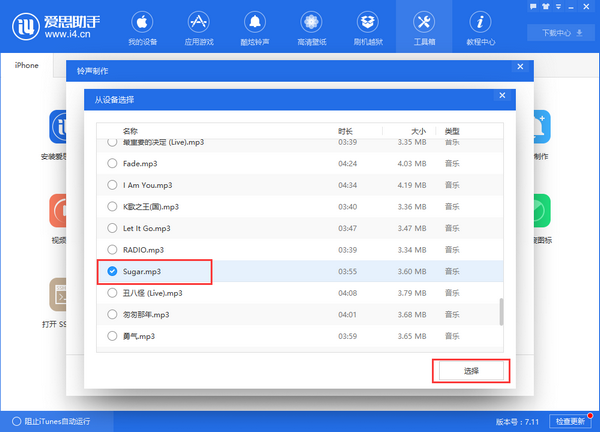 1、下載安裝后打開愛思助手,將移動(dòng)設(shè)備連接到電腦,點(diǎn)“工具箱-鈴聲制作”進(jìn)入鈴聲制作界面;