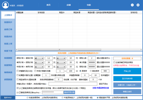 上貨助手:支持單店或群控創(chuàng)建上貨任務(wù),人工智能過(guò)濾品牌詞和文字詳情(此功能1分錢一個(gè)商品)