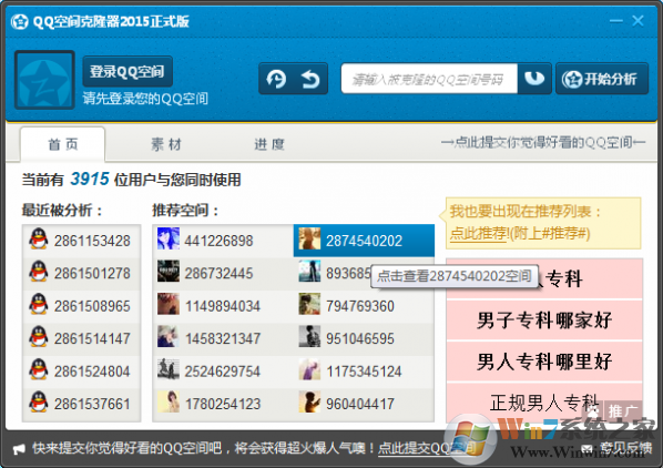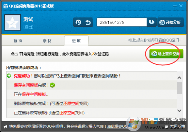 4、如果你沒有克隆素材的話,也不用著急,在首頁內(nèi)有眾多的QQ賬號可供你選擇,如果你向自主選擇克隆素材,一樣可以!在素材辦款內(nèi)提供了最新、最熱門的空間克隆素材可供你自由選擇!還沒完哦,在進度選項你還可以查看克隆的進度,自由按安排自己的時間,是不是酷斃了?。。?/p>