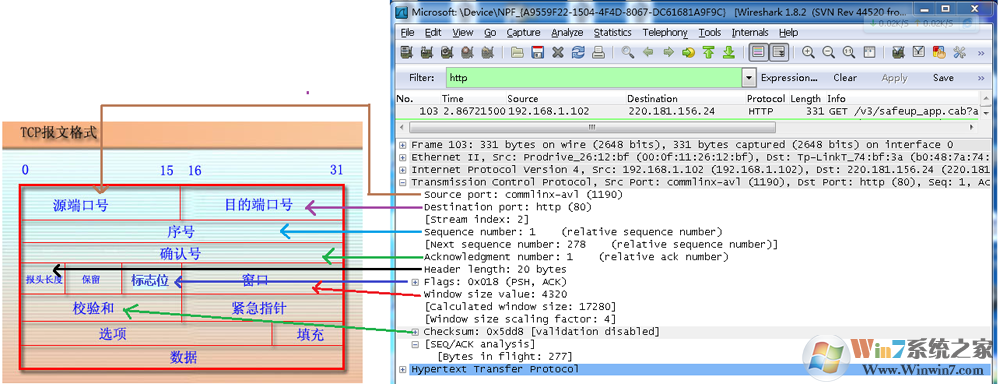 從下圖可以看到wireshark捕獲到的TCP包中的每個(gè)字段。