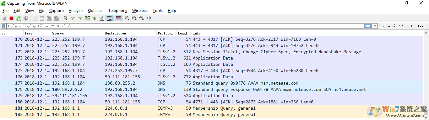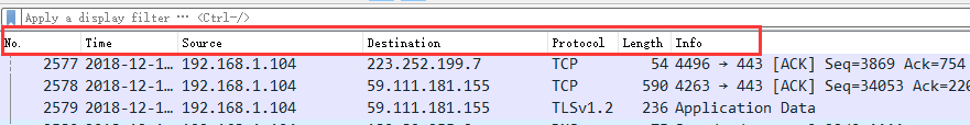 2. Packet List Pane(數(shù)據(jù)包列表), 顯示捕獲到的數(shù)據(jù)包,每個(gè)數(shù)據(jù)包包含編號(hào),時(shí)間戳,源地址,目標(biāo)地址,協(xié)議,長(zhǎng)度,以及數(shù)據(jù)包信息。 不同協(xié)議的數(shù)據(jù)包使用了不同的顏色區(qū)分顯示。