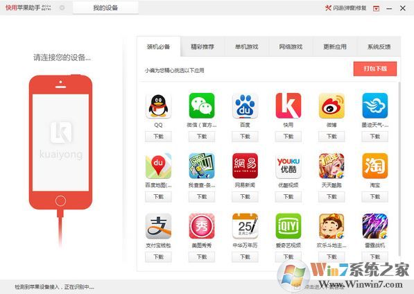 快用蘋果助手是一款支持IOS系統(tǒng)設(shè)備,如iPhone、IPAD等進(jìn)行手機(jī)管理,應(yīng)用安裝等功能為一體的軟件,讓你不需要通過Appstore就可以下載安裝應(yīng)用!其中可以免費(fèi)下載安裝很多付費(fèi)應(yīng)用,不需要越獄就可以!非常實(shí)用的一套軟件