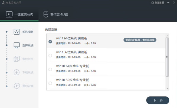 老友裝機(jī)大師已為您推薦適合電腦配置的系統(tǒng)版本,當(dāng)然我們也可另外自由選擇XP,Win7或Win10,點(diǎn)擊“下一步”。