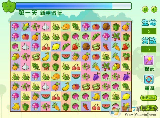 游戲中有時(shí)間限制,同時(shí)也有9個(gè)難度級(jí)別。在有限的時(shí)間里,用我們智慧消除相連的果蔬,直到所有的水果都消除,才能步入下一關(guān)卡,共9個(gè)級(jí)別等你挑戰(zhàn),加油通過9關(guān)獲得最終的勝利。