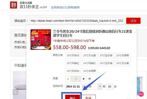 5、待插件下載完成后,將自動彈出“安裝確認(rèn)”窗口,如圖所示,在此直接點擊“確定”以便將“雙11秒殺王”安裝到360極速瀏覽器地址欄中。